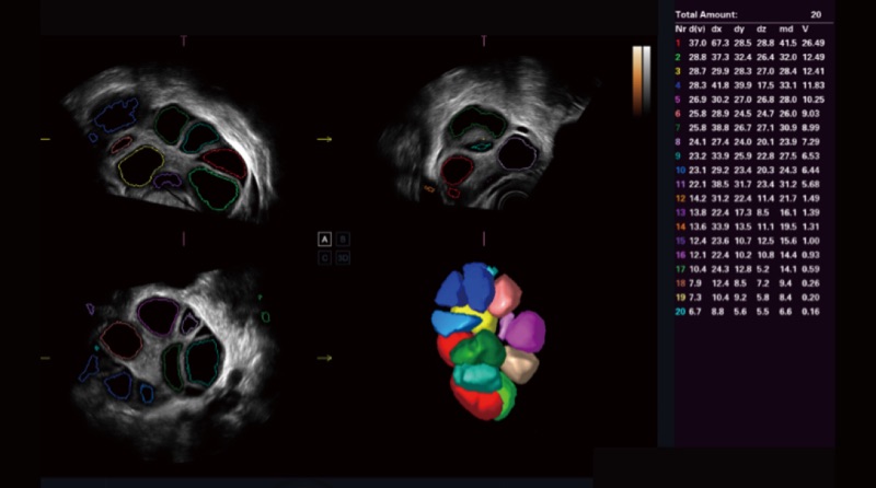 High efficiency of follicle analysis is achieved by AVC Follicle, a volume-data based automatic follicular calculation including the number and volume. Follicles are sorted by sizes in the results and rendered in different colors for better visualization.