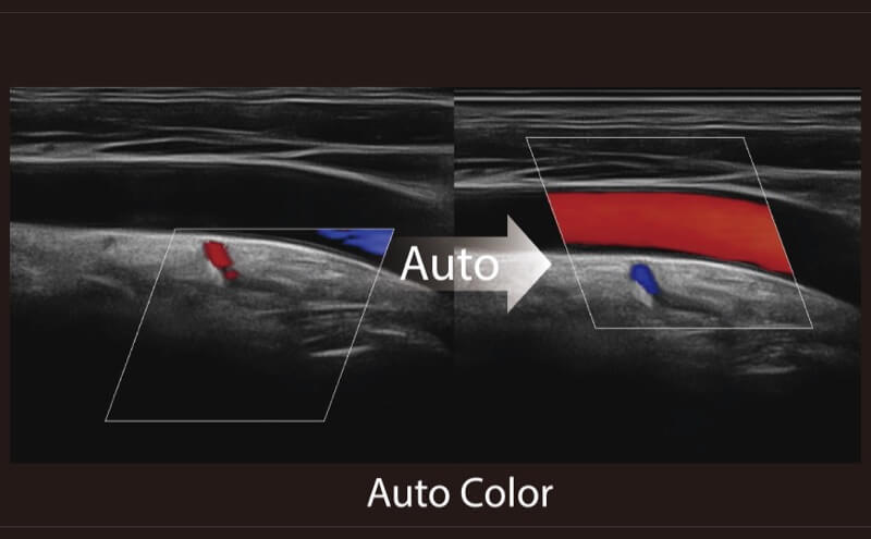 Imaging parameter adjustment is now no more done in a laborious manner. Auto B/C helps to optimize the image quality under B and color Doppler mode within just one click. Multiple parameters such as gain, TGC, ROI position, steering angle, etc., are all included in this full automation method.